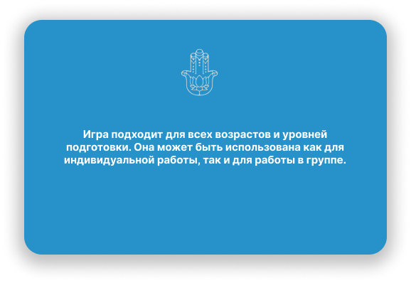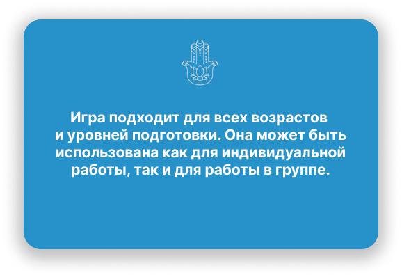 Игра подходит для всех возрастов и уровней подготовки. Она может быть использована как для индивидуальной работы, так и для работы в группе.