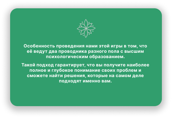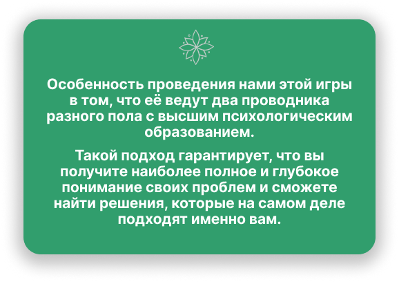 В игре нет проигравших. Каждый участник получит то, ради чего он пришел: изменения своей внутренней картины мира и как результат – возможности изменения реальности.